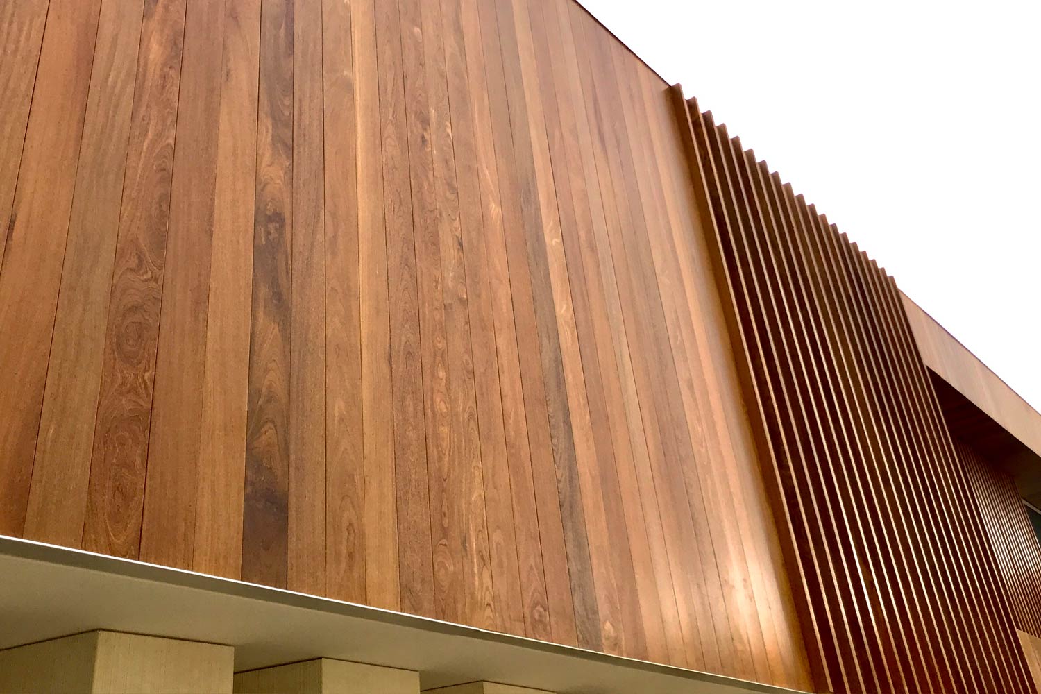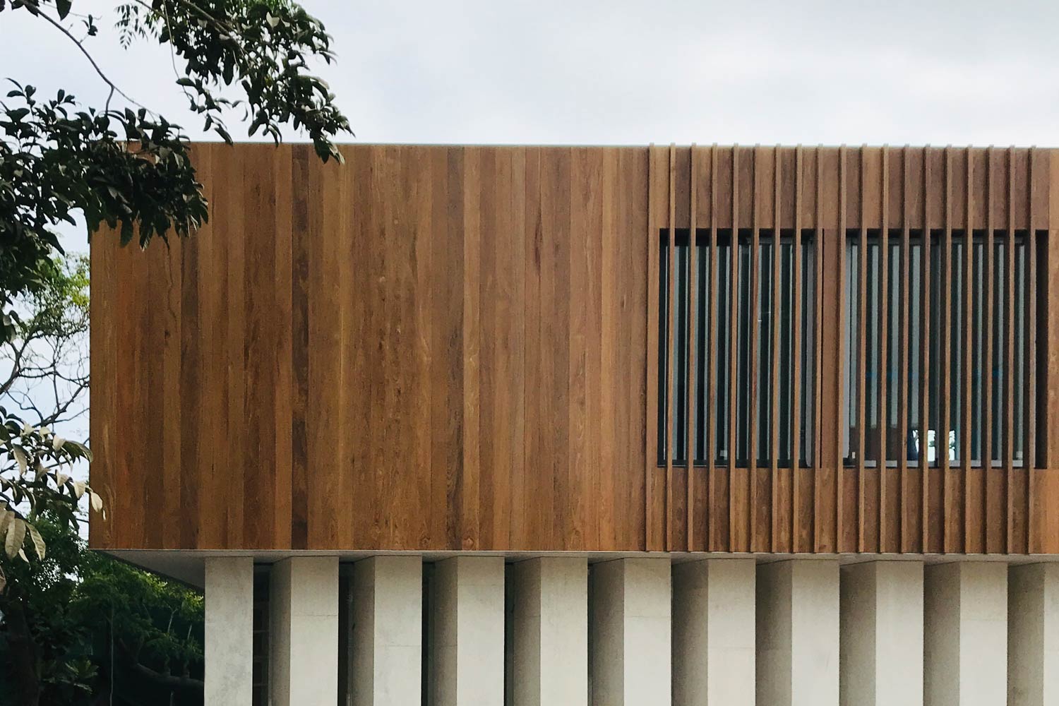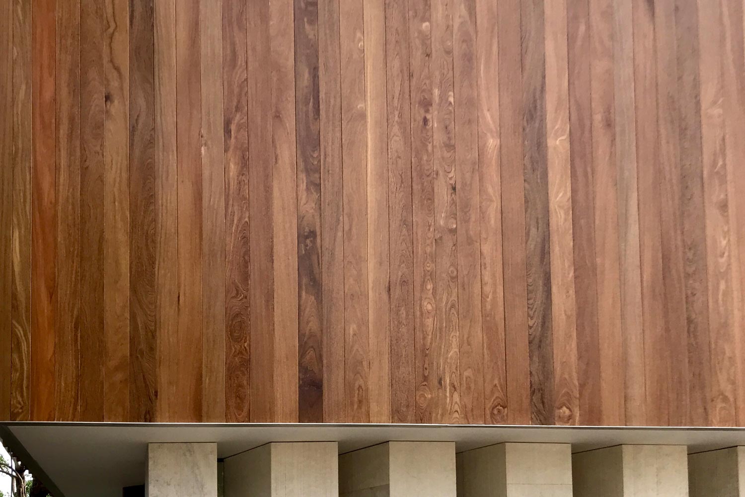 El revestimiento esconde las ventanas con secciones de celosias verticales.