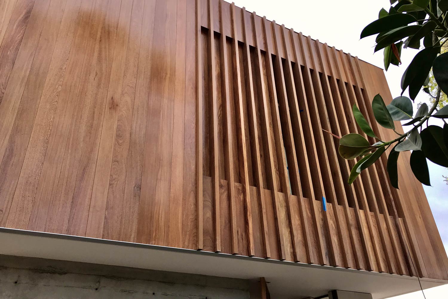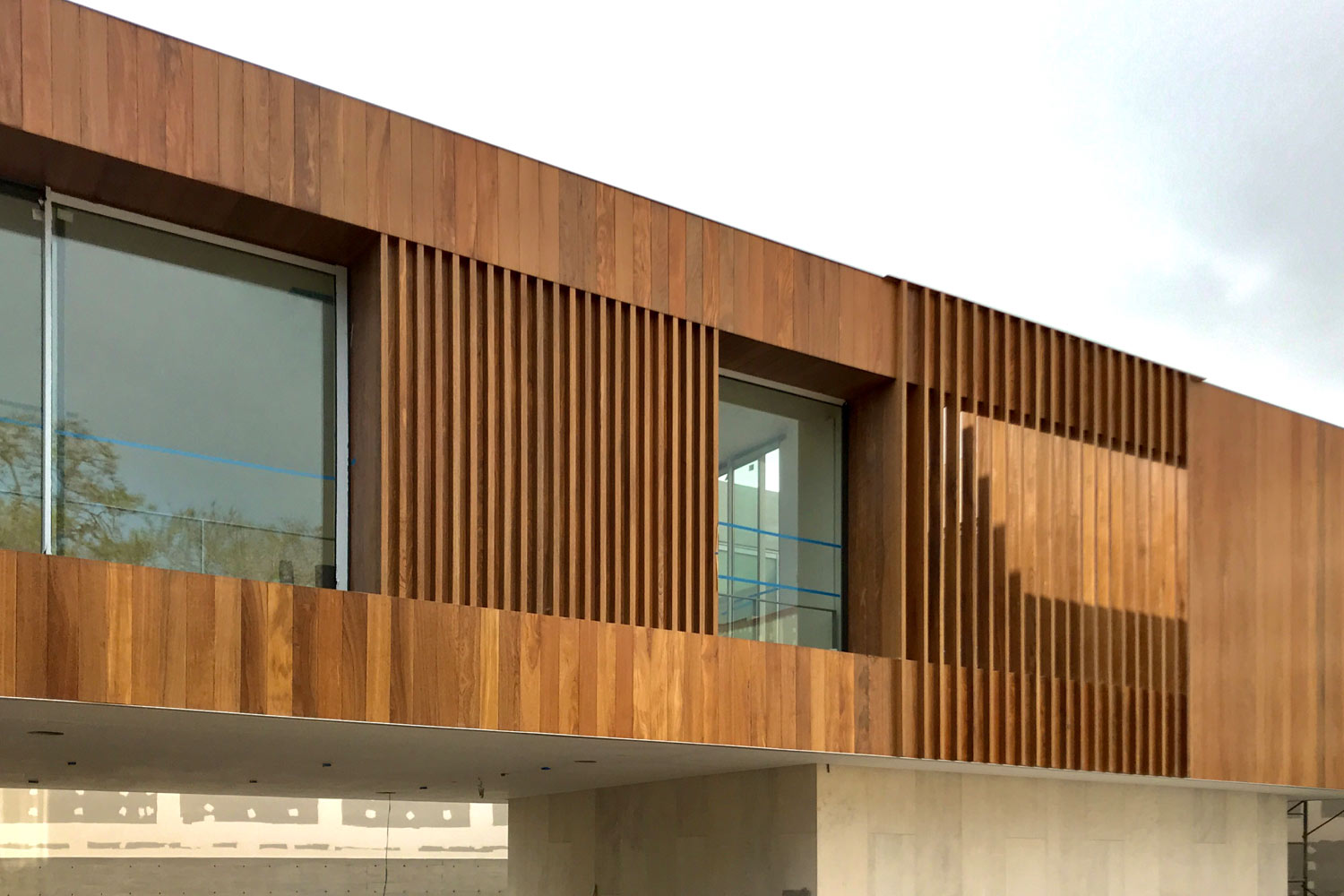 Revestimiento o forrado de madera en todas los muros exteriores del segundo piso de esta gran casa moderna en San Isidro.
