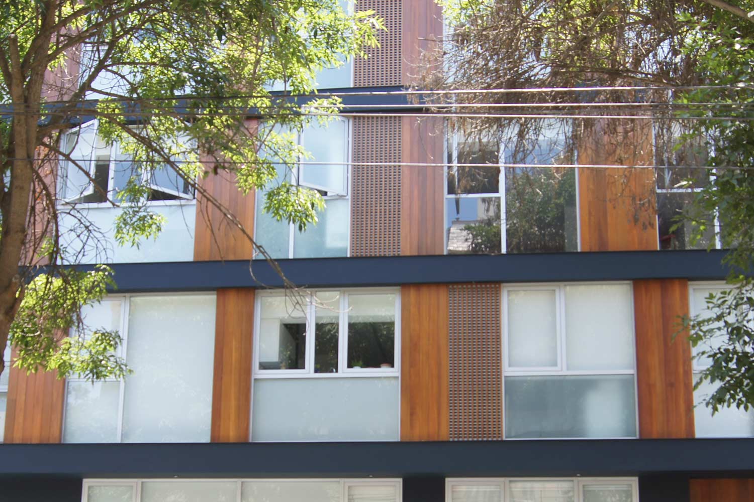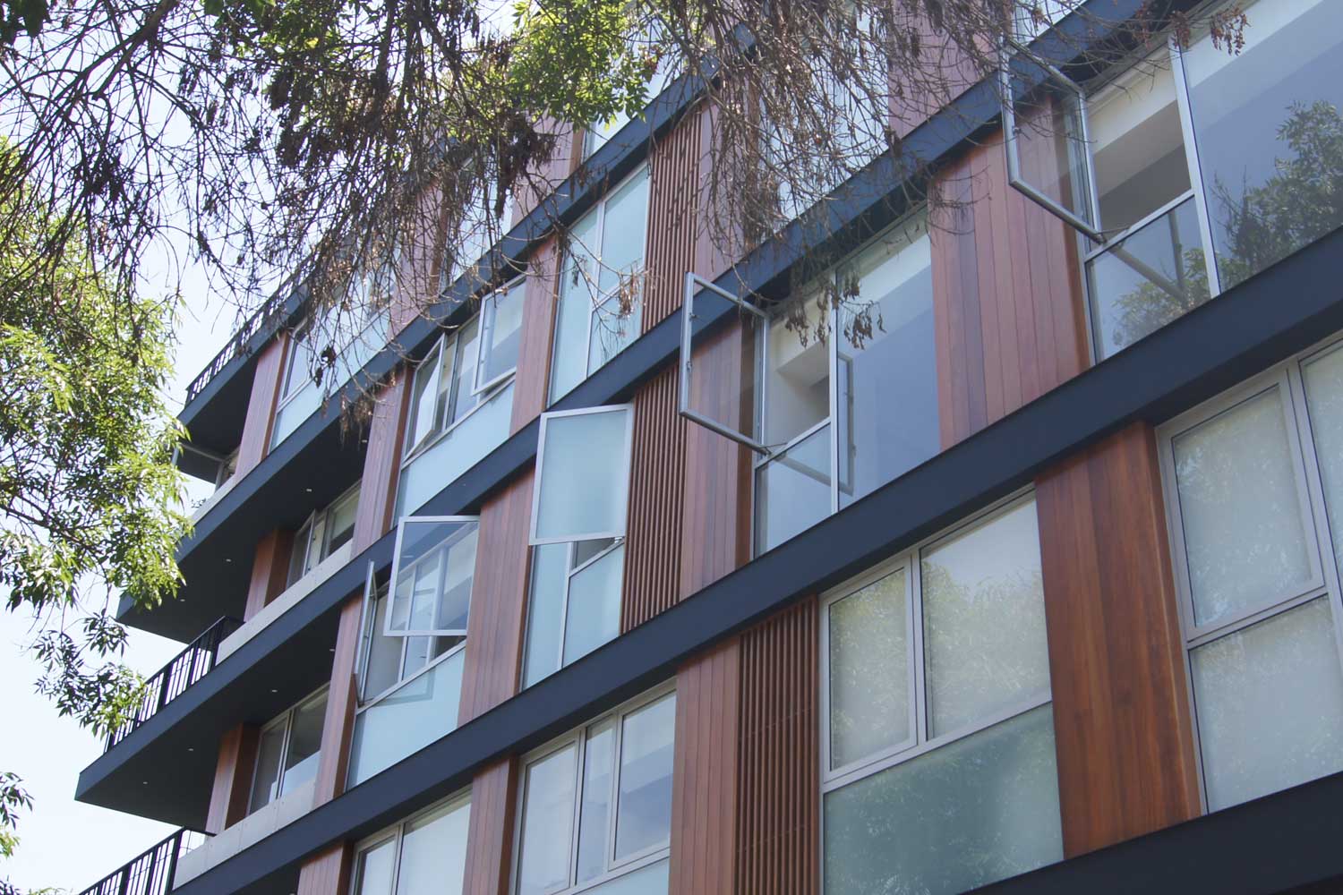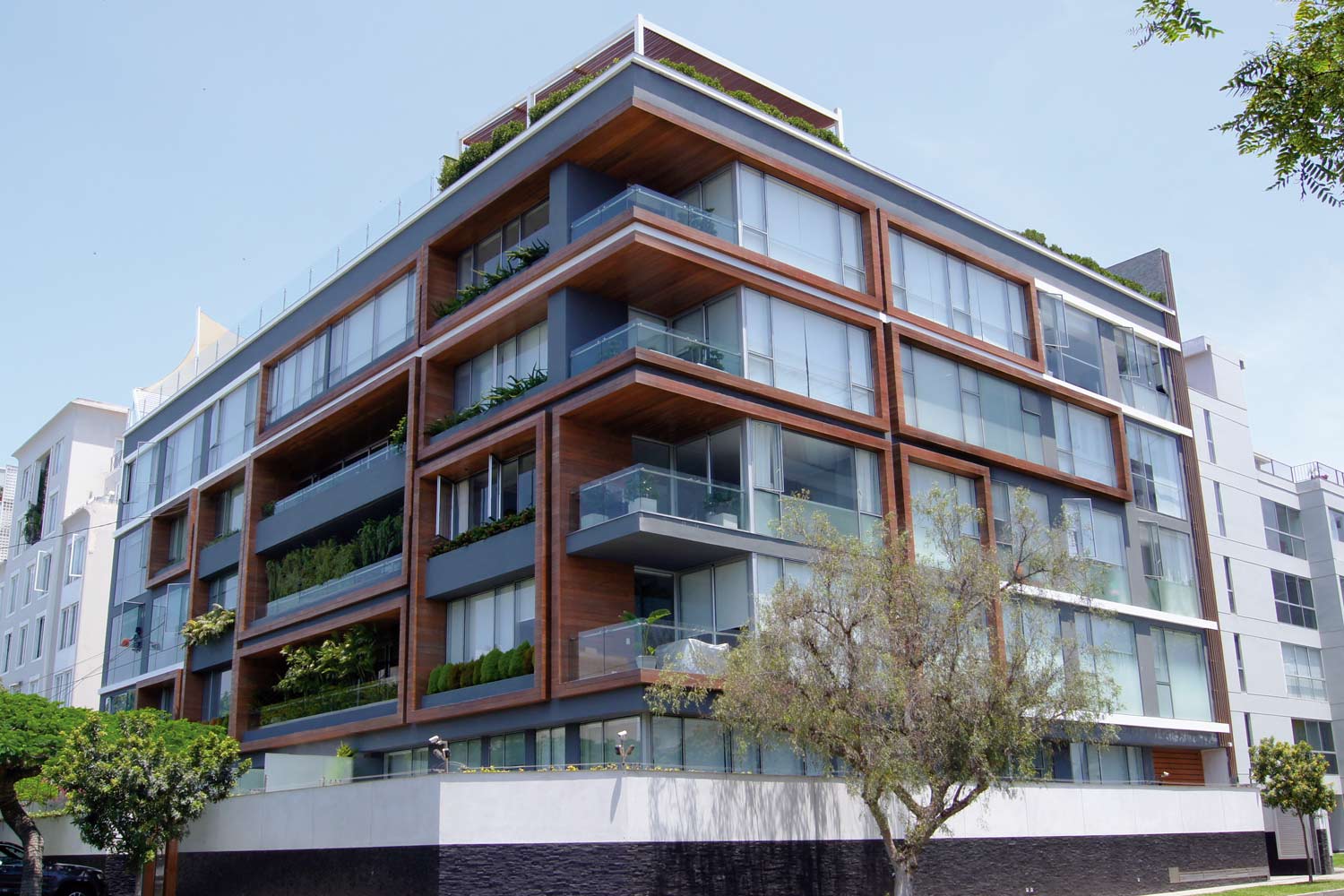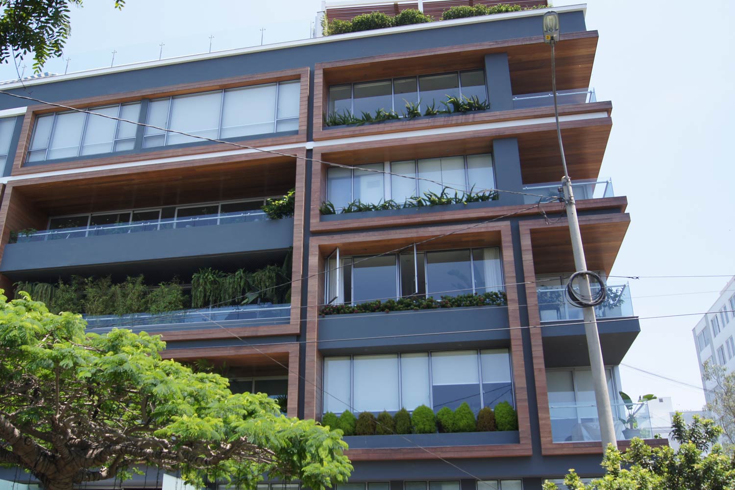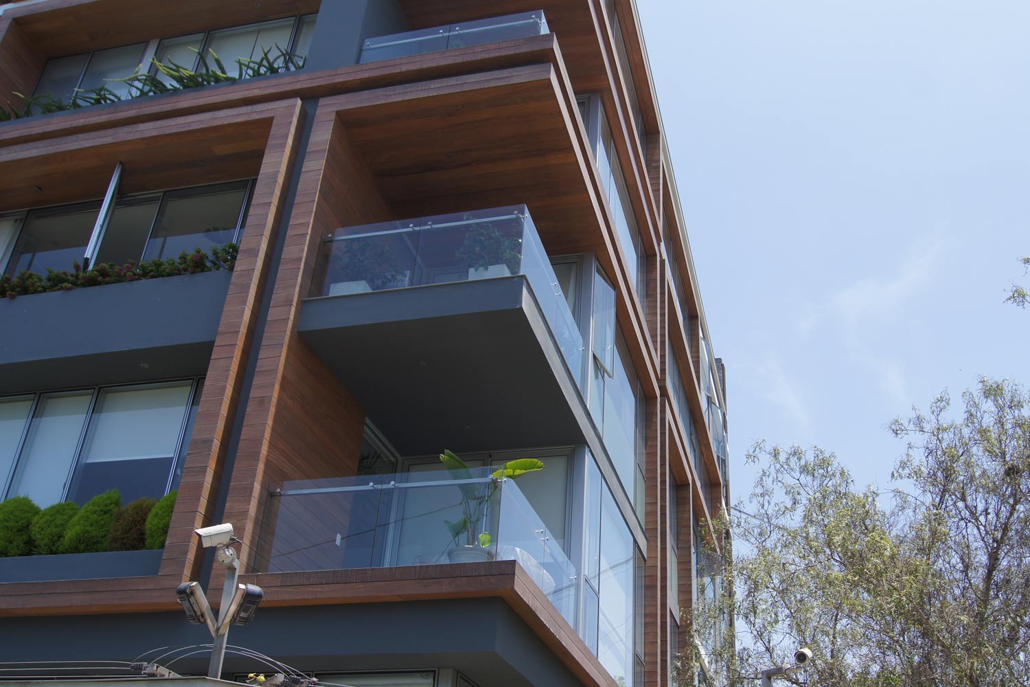 Trabajo en altura de revestimiento de los muros exteriores y de los cielos rasos de las terrazas de este edificio en San Isidro.