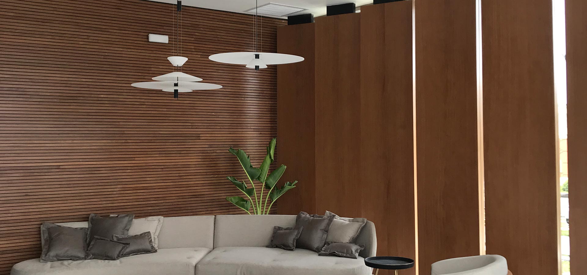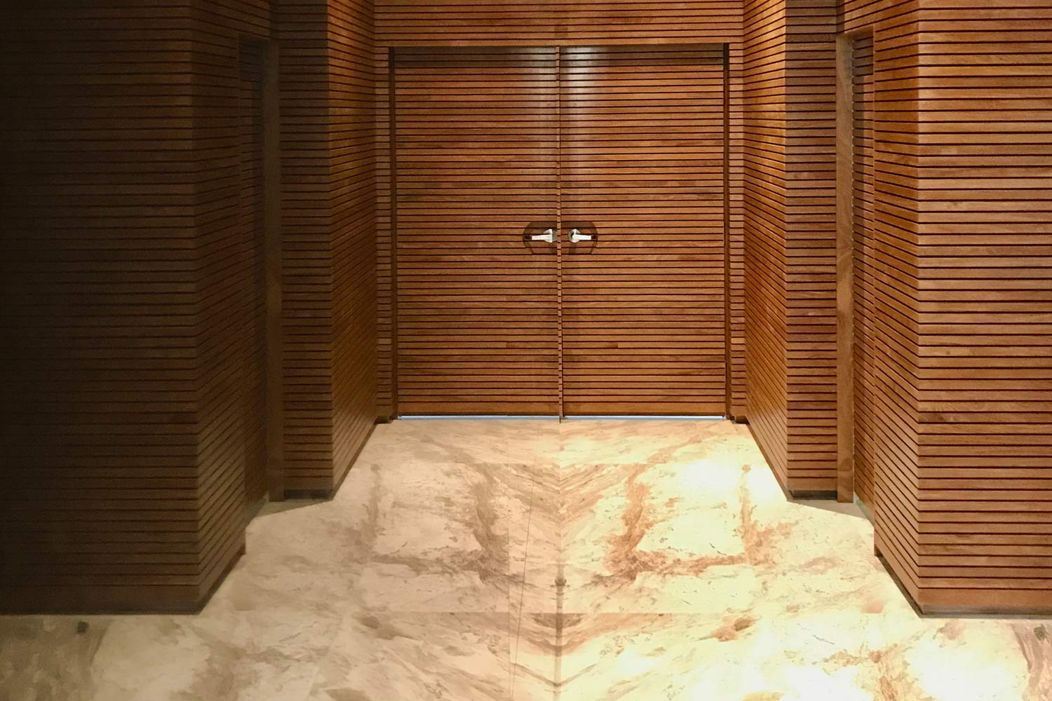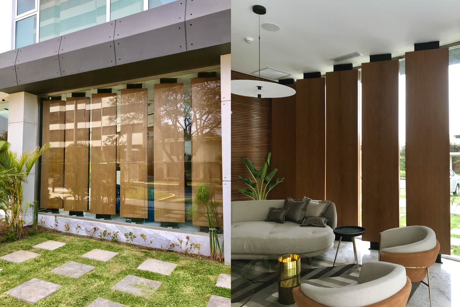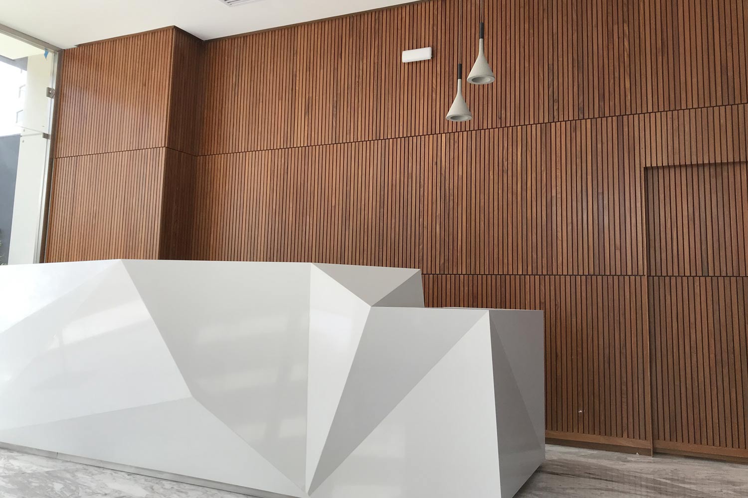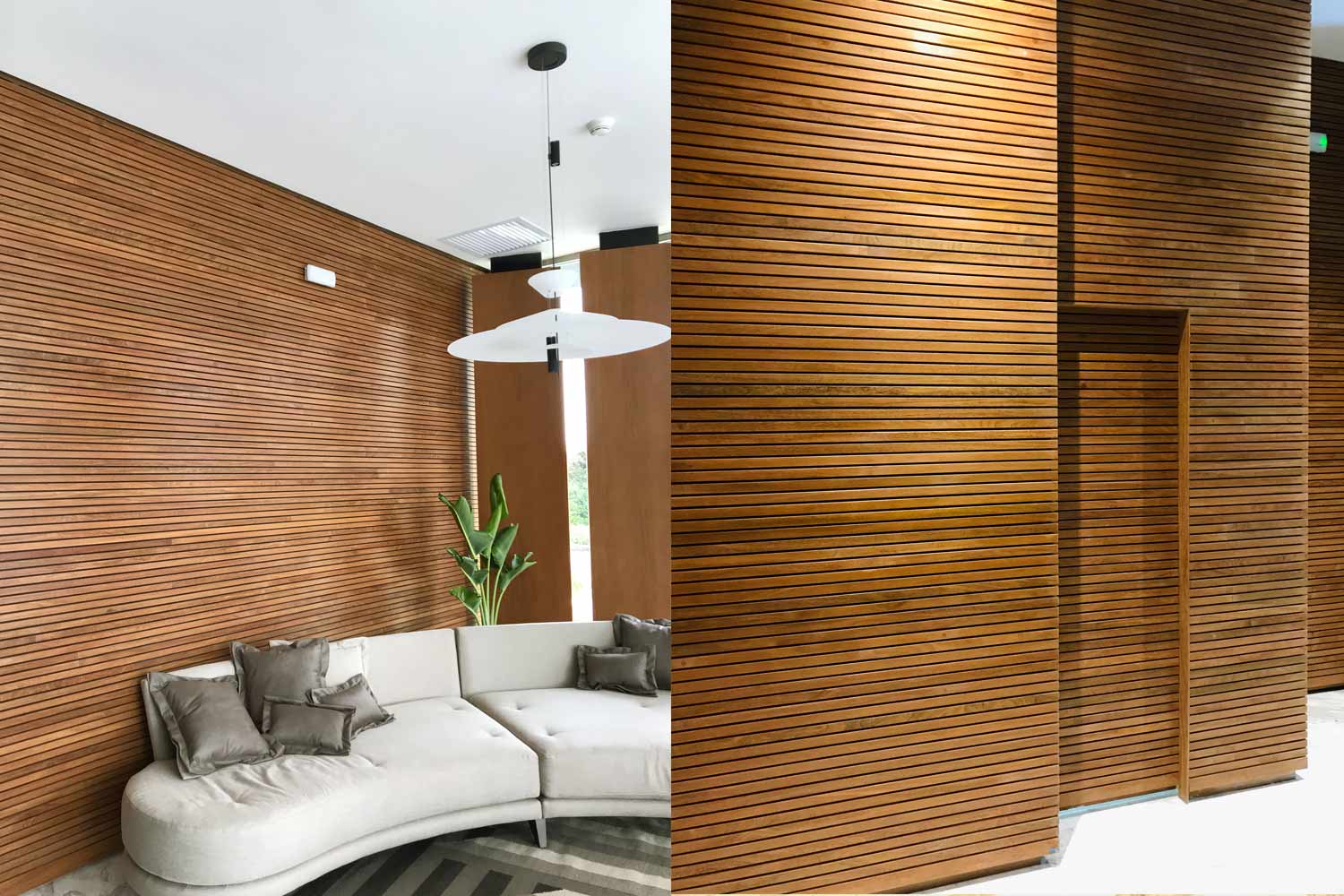 Instalación de paneles estriados o Wall Panels en todas las paredes del lobby y del hall de ascensores en este edificio nuevo frente al Golf de San Isidro.