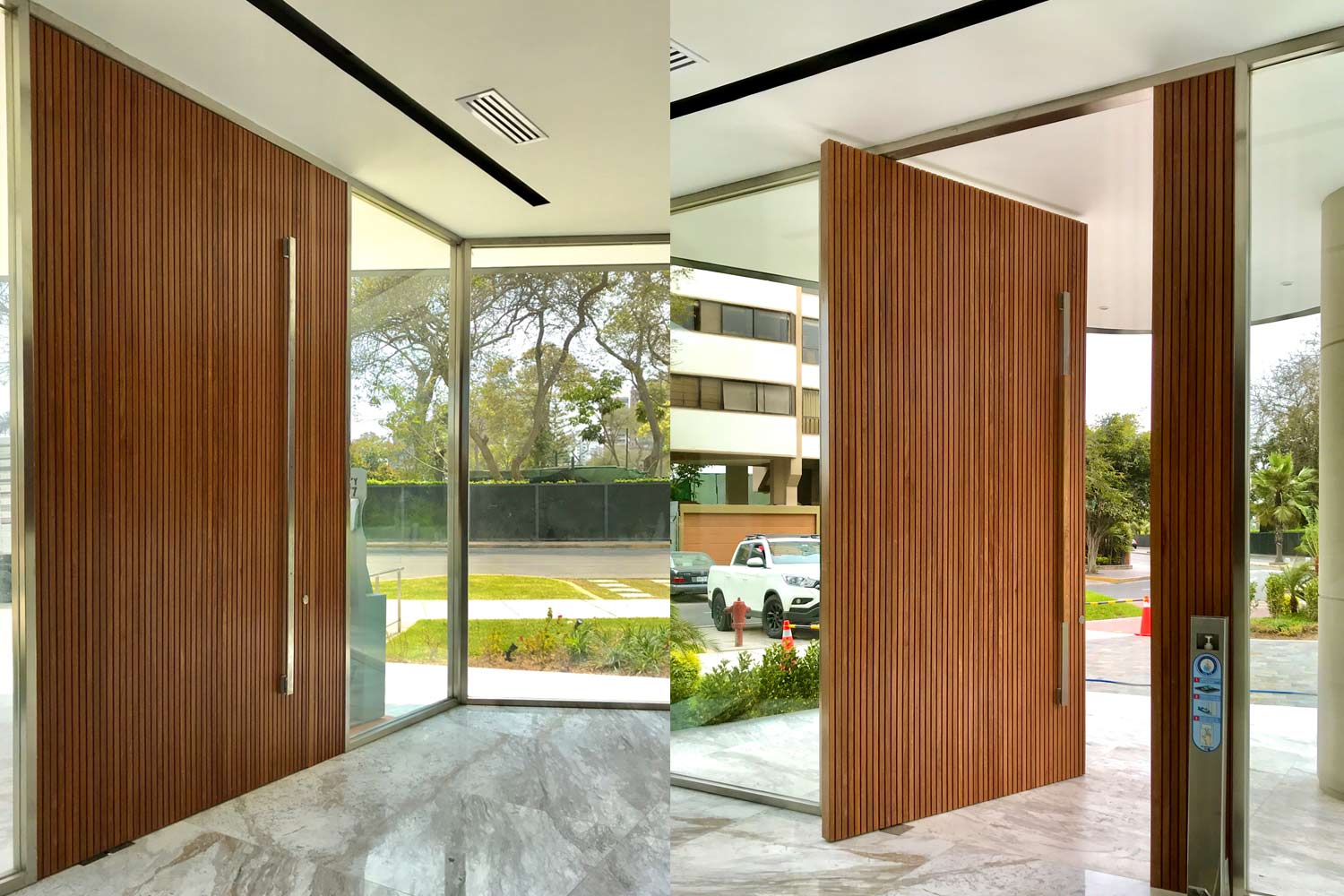 Destacamos la instalación de una importante puerta de ingreso revestida con listones de madera y accesorios en acero inoxidable.