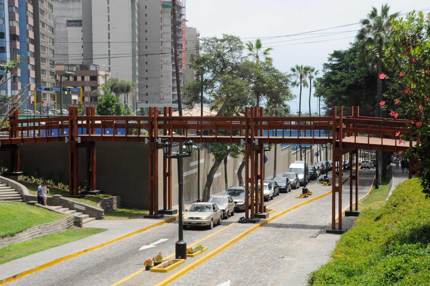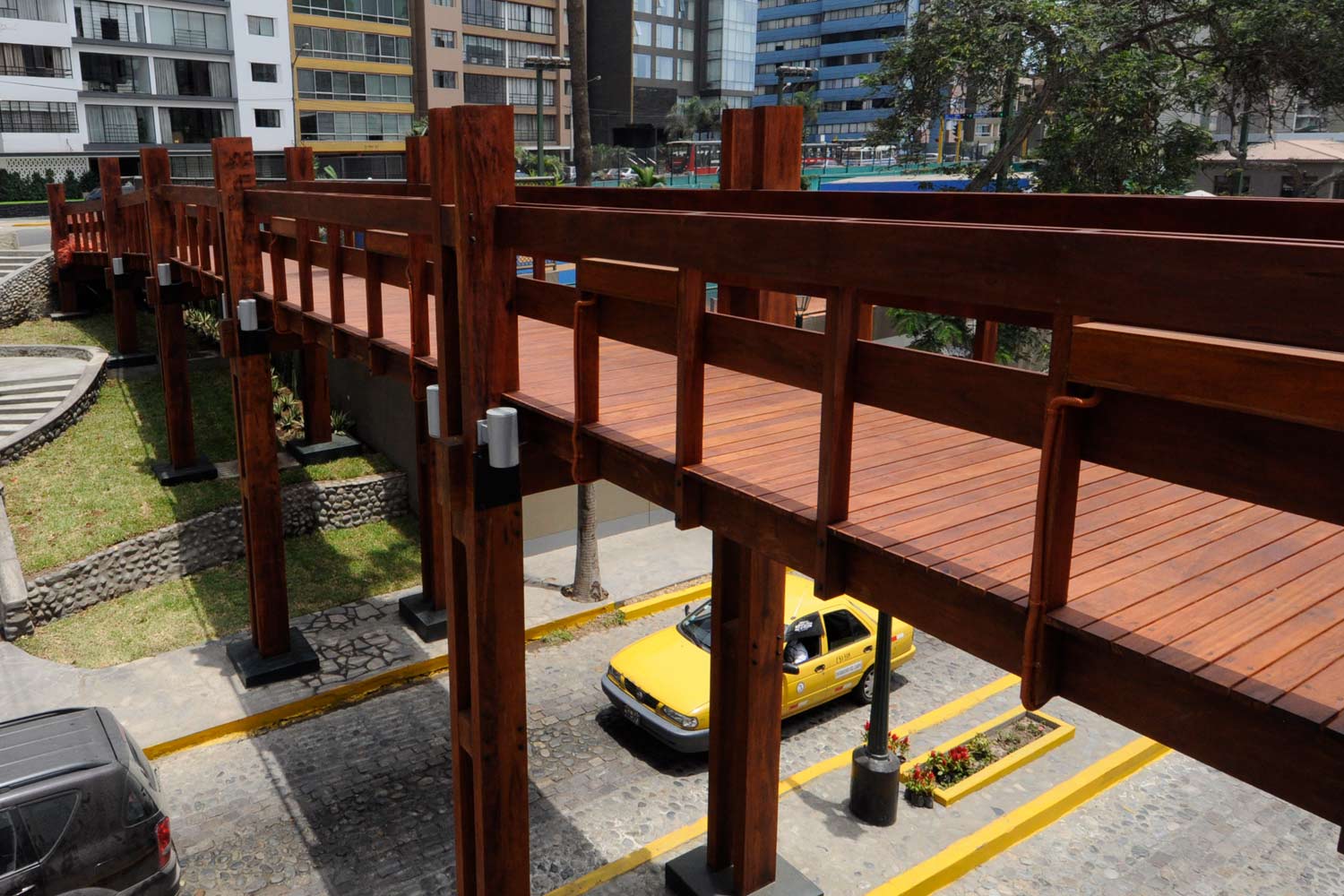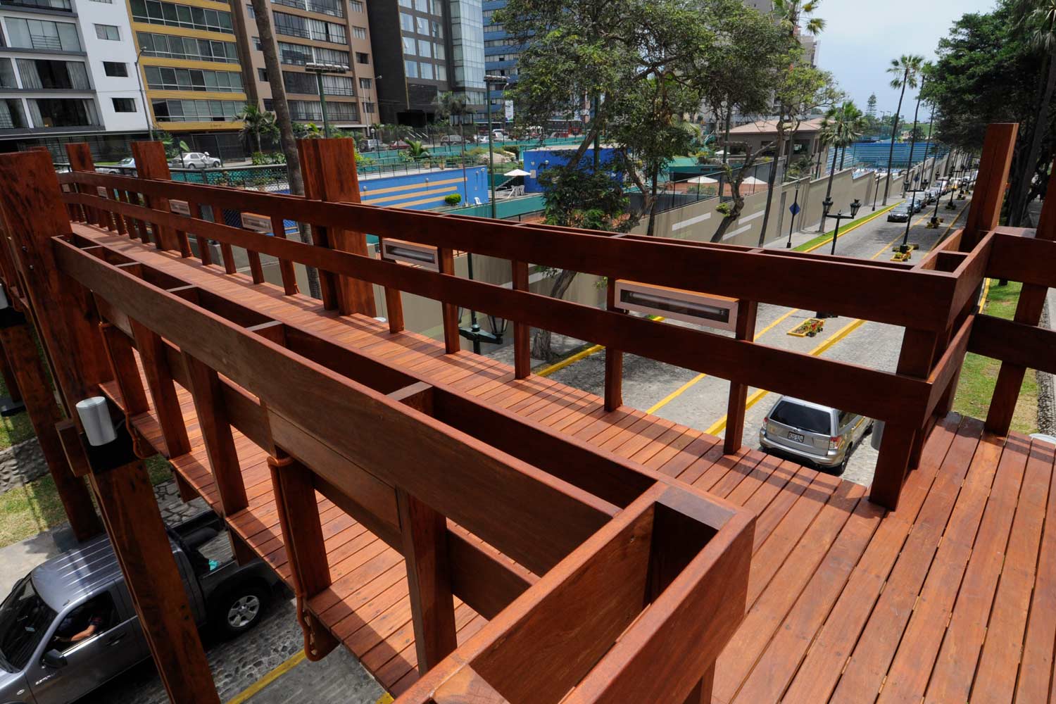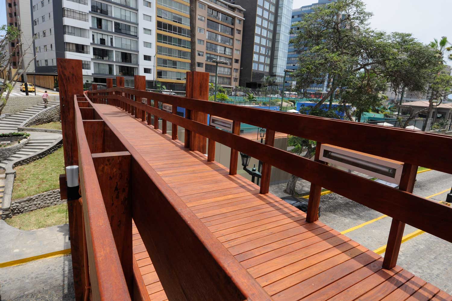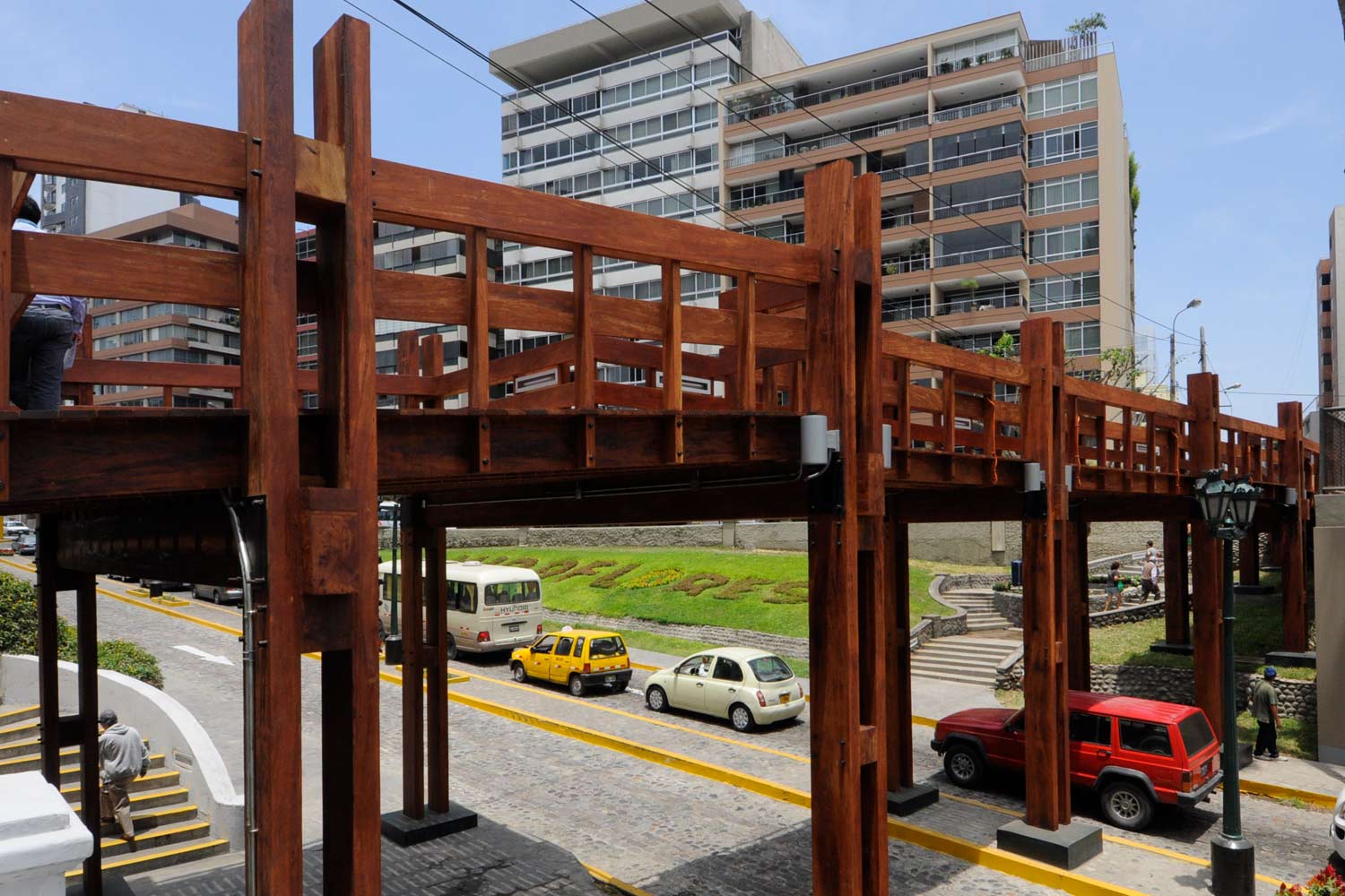 Trabajo estructural con vigas de madera sólida para levantar este puente de peatones y bicicletas en el corazón de Miraflores.